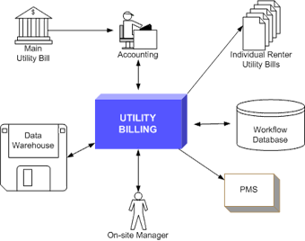 On-site managers and accounting staff collaborate using Utility Billing to verify bill information. When the bill information is approved, Utility Billing prepares printable versions of bills for renters and updates the AMLI PMS with utility billing information.